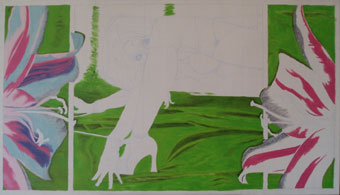 1. blumen fertig, 1. körper incl. weiße retusche des zu dick angelegten schattens im vorderen handschuh, ansatz fürs 2. grün mitte(ist mir aber zu gelb)